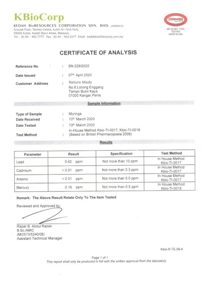 SIJIL ANALISA TERHADAP TEH PURE MORINGA
